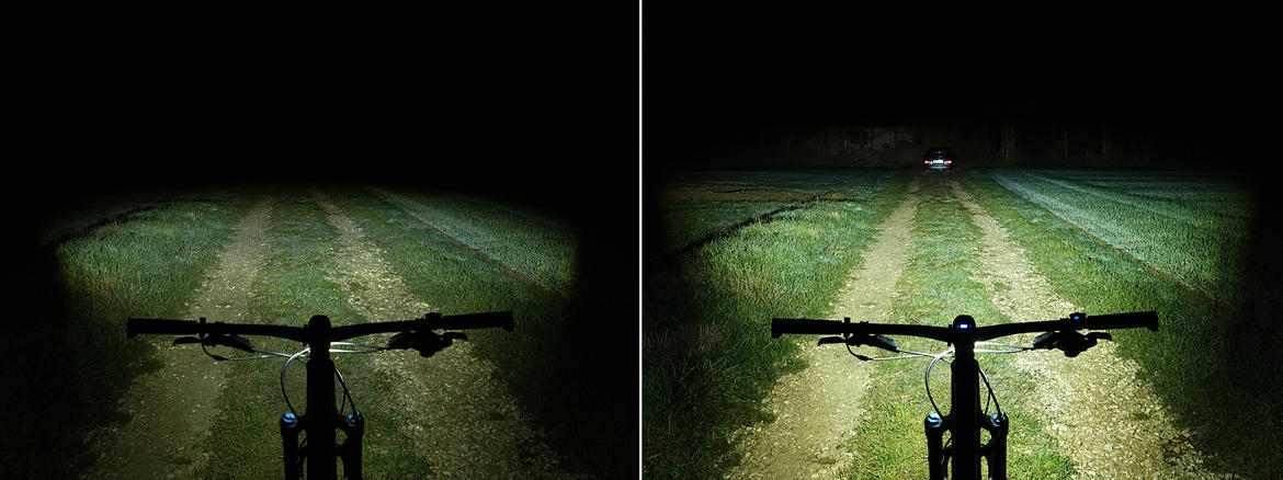 HelljusMatta av ljus, en bred och homogen ljusmatta direkt framför din cykel. Och när du slår på 1300 lumen, då får du ljus även långt framför dig. |